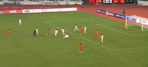 49’越南队制造威胁攻势,阮国越打门遭守卫球员阻挡被守门员得到