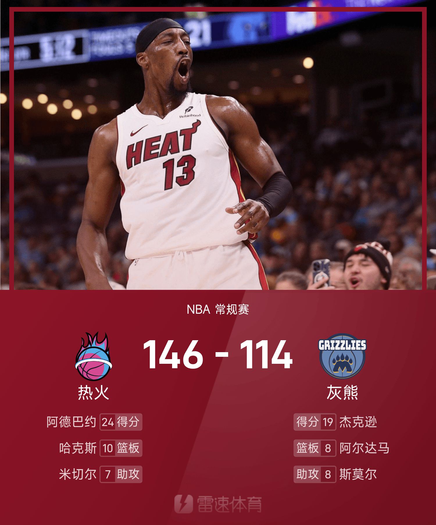 NBA战报:阿德巴约24分,热火146-114狂胜灰熊