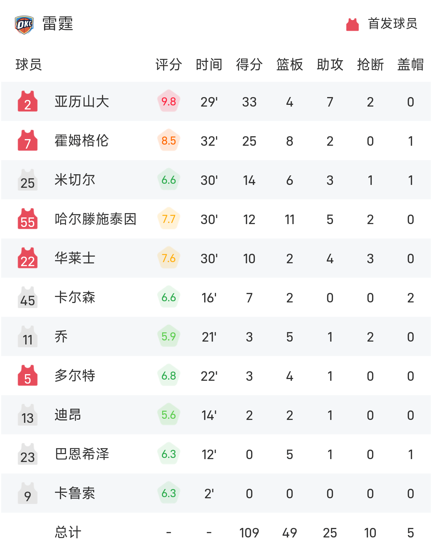 亚历山大砍下全场最高的33分4板7助,率领雷霆胜利取胜。