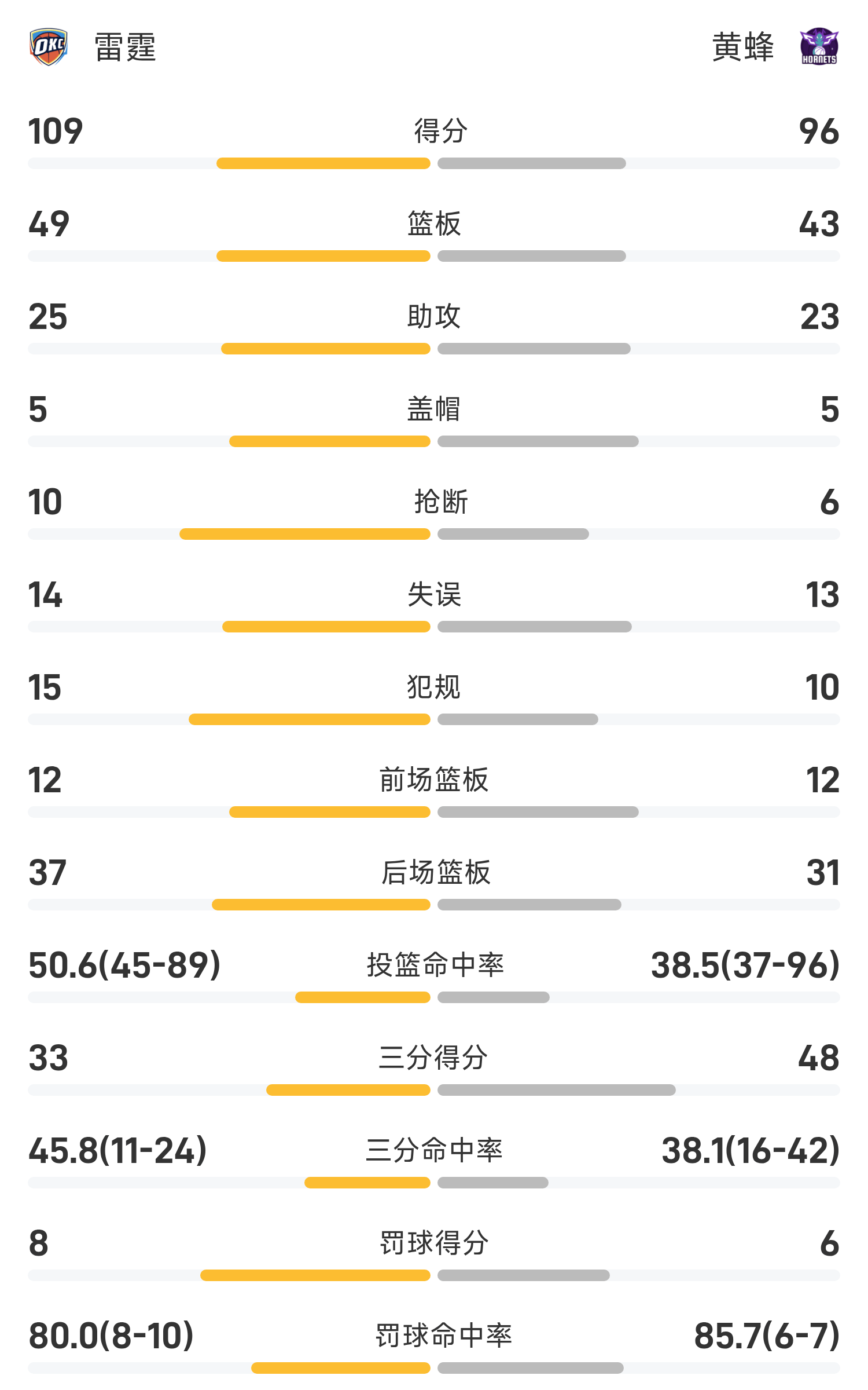 双方全场战罢,黄蜂96-109不敌雷霆。