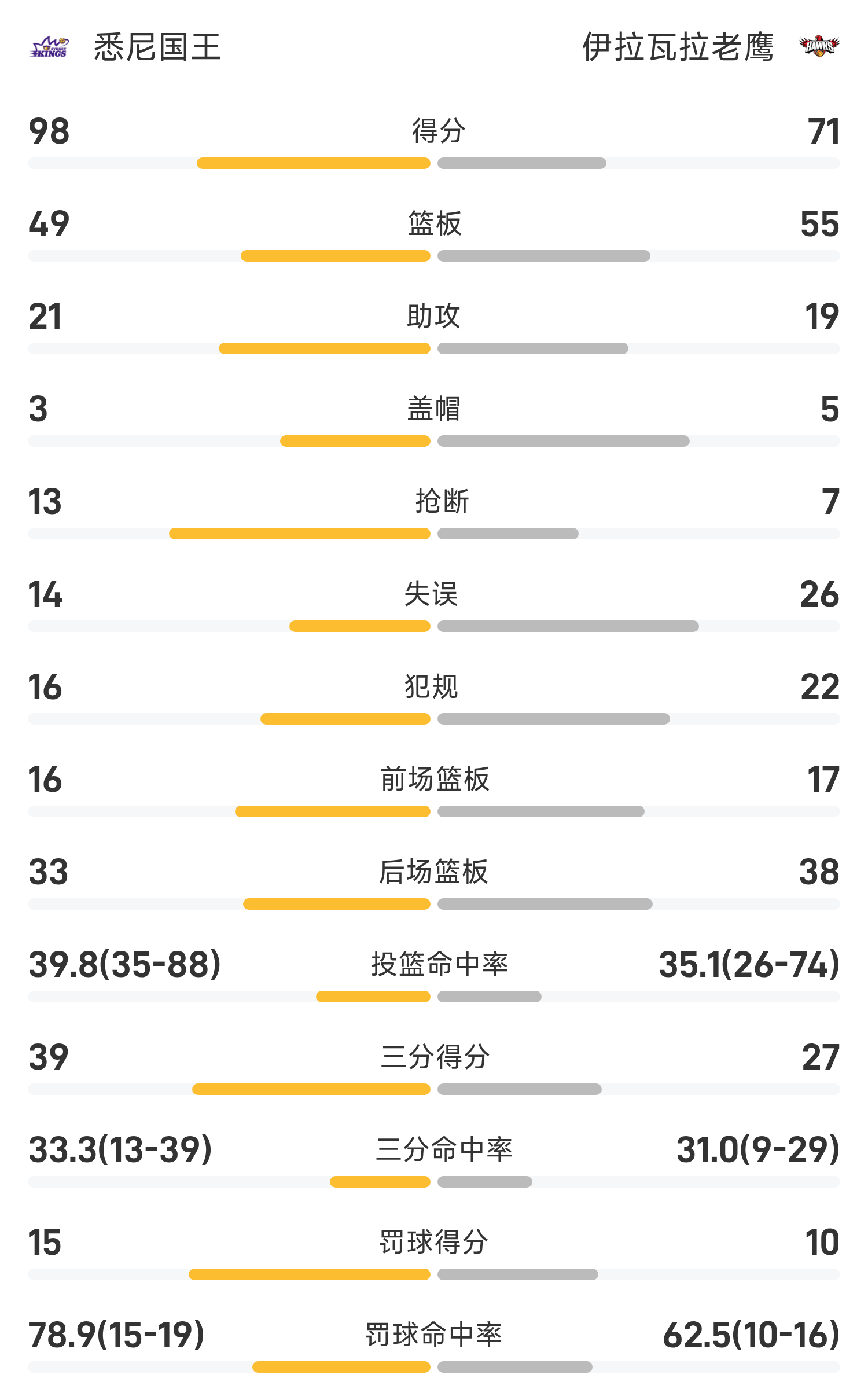 双方全场战罢,伊拉瓦拉老鹰71-98不敌悉尼国王。